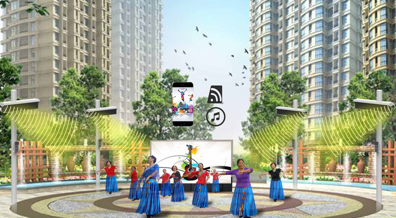 智慧廣場舞系統因時制宜,采用專業領先的定向聲技術,使聲音在系統前方一定角度內清晰傳播。根據活動場地的大小與周圍環境,制定相匹配的定向聲解決方案,以達到聲效的最大優化。